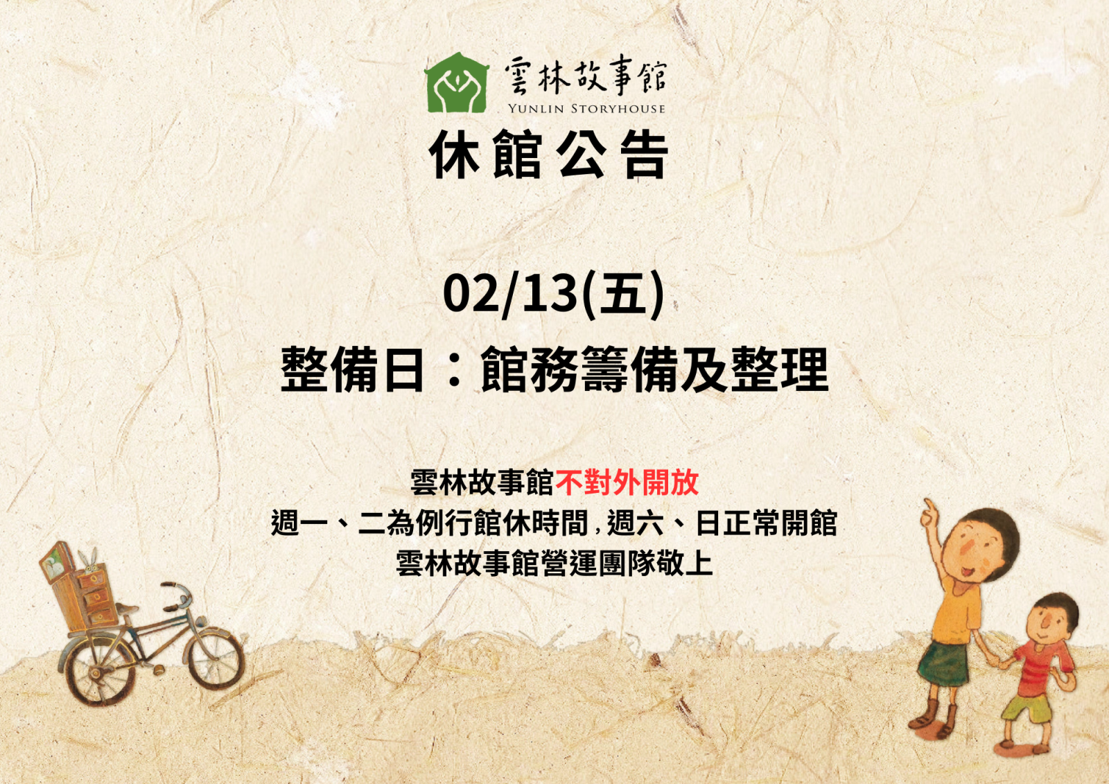 整備日:2/13(五)不對外開放